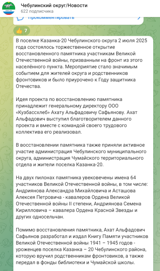 В восстановлении памятника также приняли активное участие администрация Чебулинского муниципального округа, администрация Чумайского территориального отдела и жители посёлка Казанка-20.